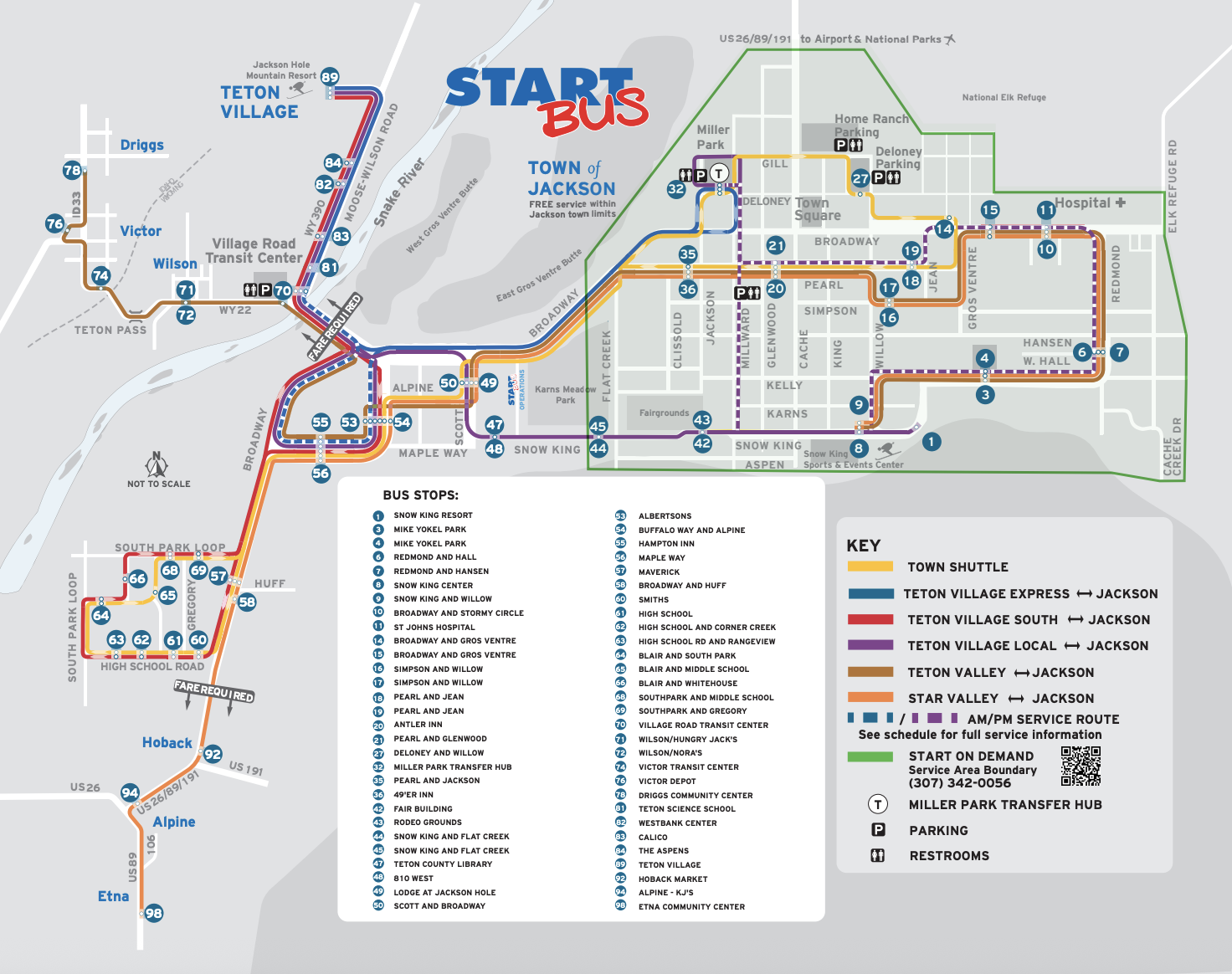 Sign with route information: Stop 47 Teton County Library is closest to the Virginian Lodge, Stop 21 Pearl and Glenwood is closest to Downtown Jackson. The purple route: Teton Village local stops closest to the Virginian Lodge (Stop 47) and to Downtown (Stop 21).